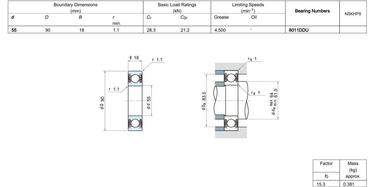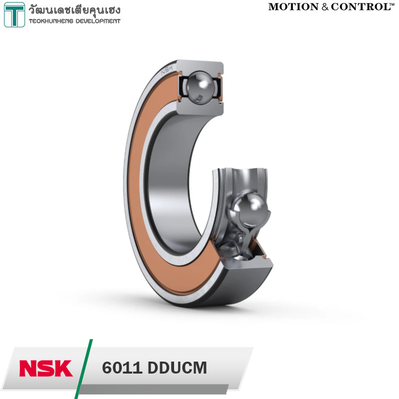 NSK 6011 DDUCM มีขนาดวงใน 55 มิล วงนอก 90 มิล หนา 18 มิล เป็นตลับลูกปืนเม็ดกลมร่องลึก ฝายางแบบสัมผัสสองด้าน แถวเดียว มีแรงเสียดทานต่ำ เสียงเงียบ สามารถรองรับความเร็วรอบสูง รองรับแรงทั้งแนวรัศมีและแนวแกน