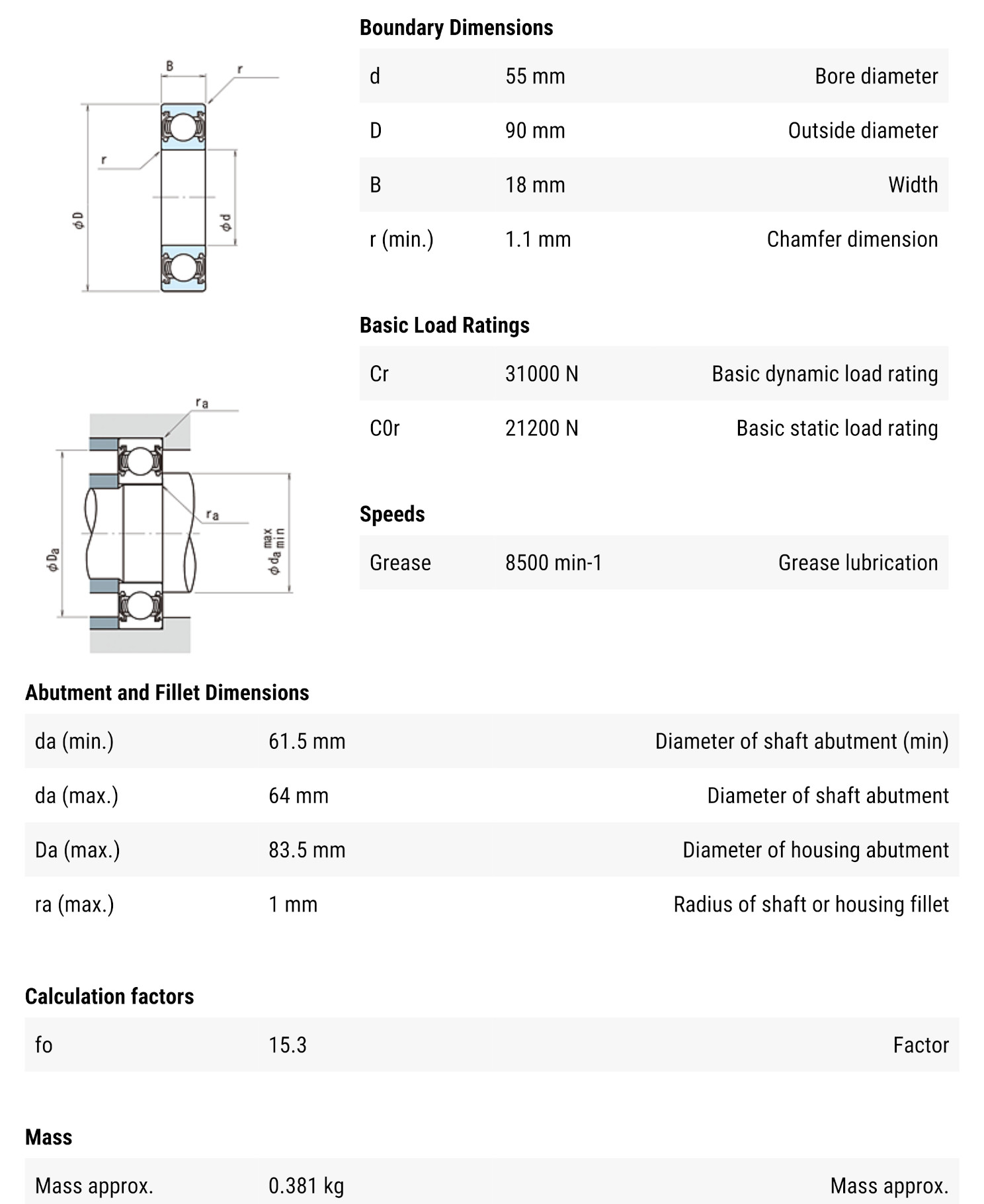 NSK 6011ZZCM มีขนาดวงใน 55 มิล วงนอก 90 มิล หนา 18 มิล เป็นตลับลูกปืนเม็ดกลมร่องลึก ฝาเหล็กสองด้าน แถวเดียว มีแรงเสียดทานต่ำ เสียงเงียบ สามารถรองรับความเร็วรอบสูง รองรับแรงทั้งแนวรัศมีและแนวแกน