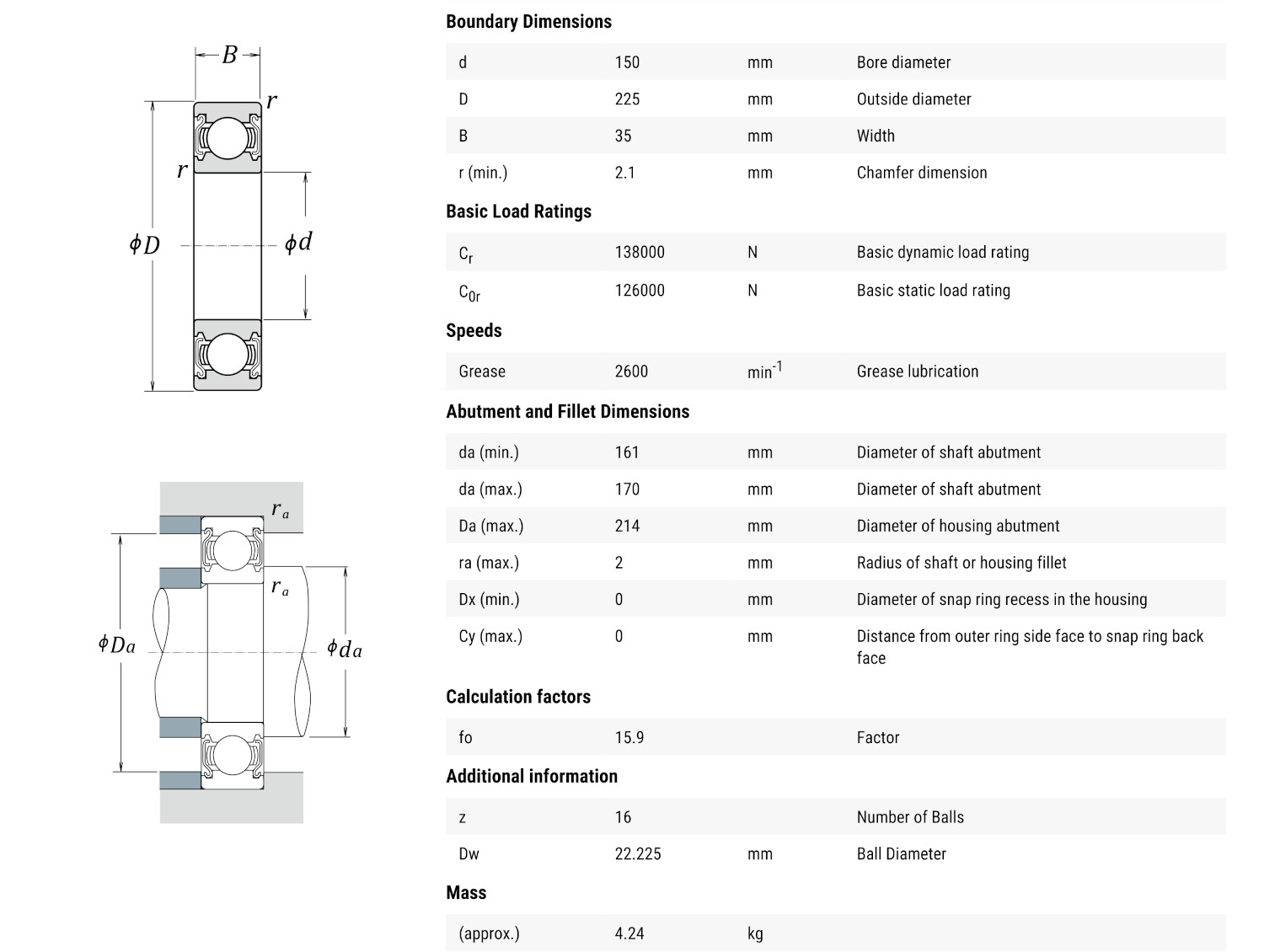 NSK 6030ZZCM มีขนาดวงใน 150 มิล วงนอก 225 มิล หนา 35 มิล เป็นตลับลูกปืนเม็ดกลมร่องลึก ฝาเหล็กสองด้าน แถวเดียว มีแรงเสียดทานต่ำ เสียงเงียบ สามารถรองรับความเร็วรอบสูง รองรับแรงทั้งแนวรัศมีและแนวแกน