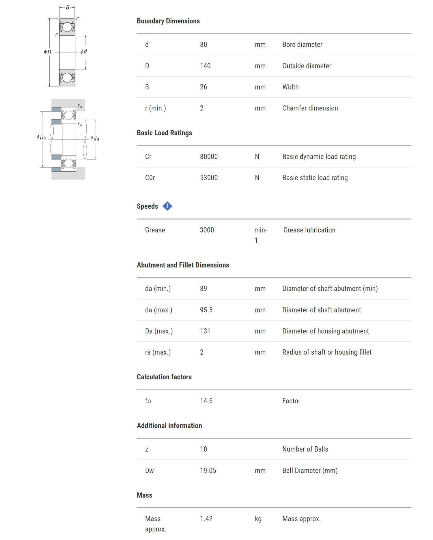 NSK 6216DDU มีขนาดวงใน 80 มิล วงนอก 140 มิล หนา 26 มิล เป็นตลับลูกปืนเม็ดกลมร่องลึก มีฝายางแบบสัมผัสสองด้าน แถวเดียว รังเหล็ก มีแรงเสียดทานต่ำ เสียงเงียบ สามารถรองรับความเร็วรอบสูง รองรับแรงทั้งแนวรัศมีและแนวแกน