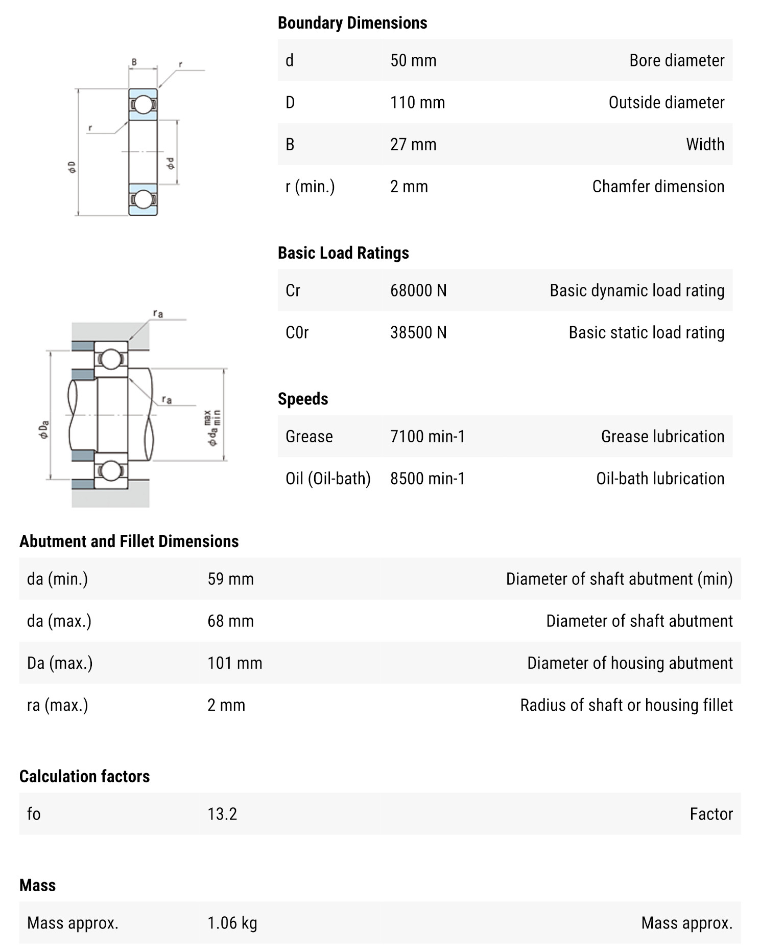 NSK 6310CM มีขนาดวงใน 50 มิล วงนอก 110 มิล หนา 27 มิล เป็นตลับลูกปืนเม็ดกลมร่องลึก ไม่มีฝา แถวเดียว รังเหล็ก มีแรงเสียดทานต่ำ เสียงเงียบ สามารถรองรับความเร็วรอบสูง รองรับแรงทั้งแนวรัศมีและแนวแกน