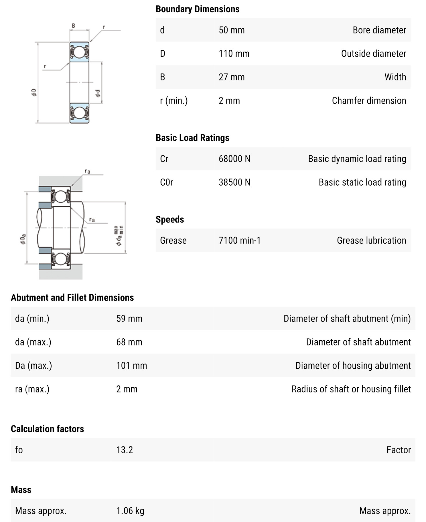 NSK 6310ZZCM มีขนาดวงใน 50 มิล วงนอก 110 มิล หนา 27 มิล เป็นตลับลูกปืนเม็ดกลมร่องลึก มีฝาเหล็กสองด้าน แถวเดียว รังเหล็ก มีแรงเสียดทานต่ำ เสียงเงียบ สามารถรองรับความเร็วรอบสูง รองรับแรงทั้งแนวรัศมีและแนวแกน