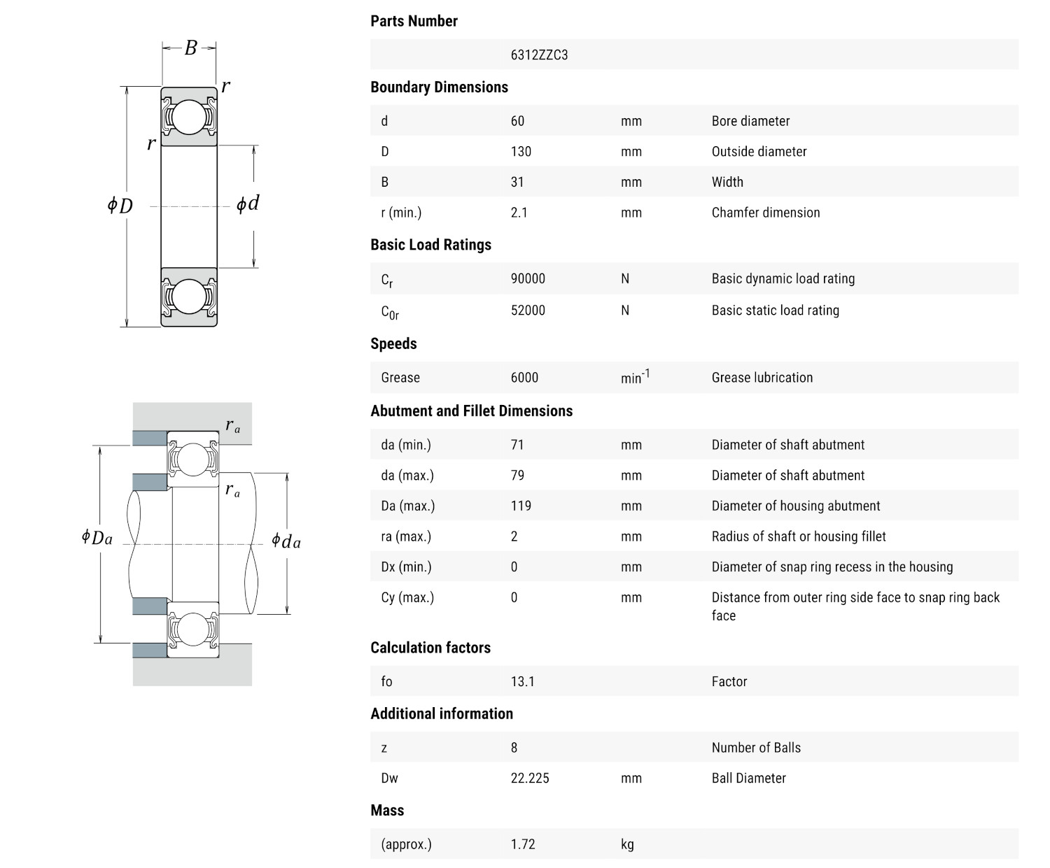 NSK 6312ZZC3 มีขนาดวงใน 60 มิล วงนอก 130 มิล หนา 31 มิล เป็นตลับลูกปืนเม็ดกลมร่องลึก ฝาเหล็กสองด้าน แถวเดียว มีแรงเสียดทานต่ำ เสียงเงียบ สามารถรองรับความเร็วรอบสูง รองรับแรงทั้งแนวรัศมีและแนวแกน