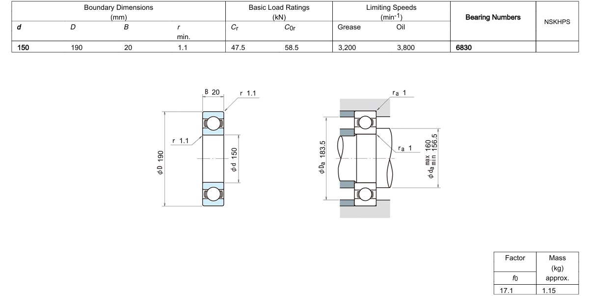 NSK 6830 มีขนาดวงใน 150 มิล วงนอก 190 มิล หนา 20 มิล เป็นตลับลูกปืนเม็ดกลมร่องลึก ไม่มีฝา แถวเดียว มีแรงเสียดทานต่ำ เสียงเงียบ สามารถรองรับความเร็วรอบสูง รองรับแรงทั้งแนวรัศมีและแนวแกน
