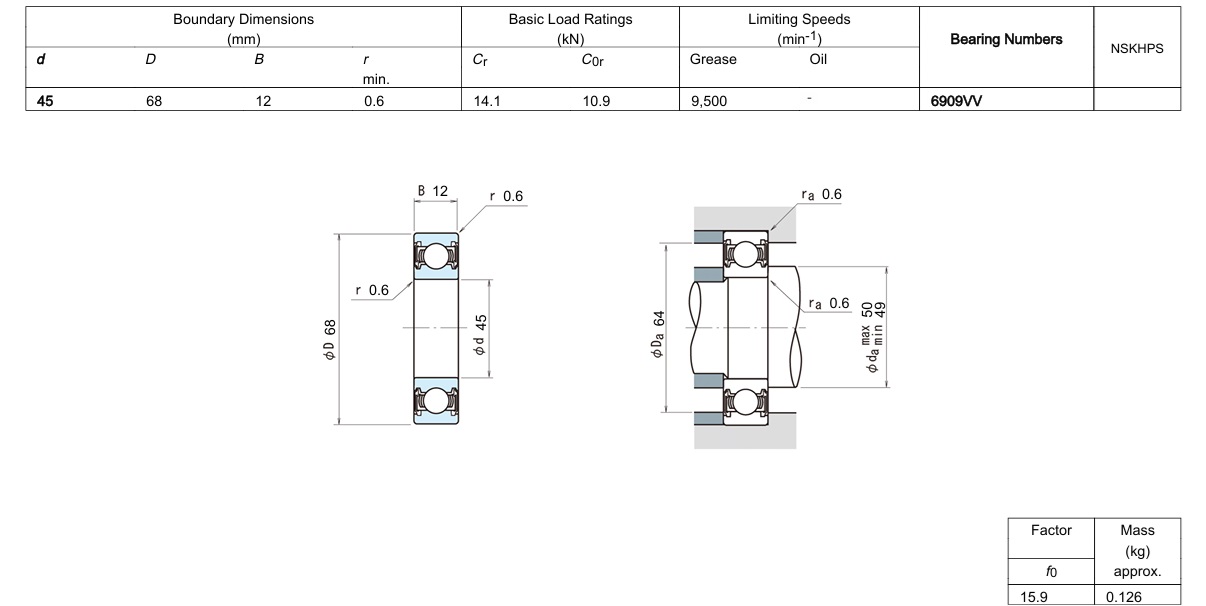 NSK 6909VVCM มีขนาดวงใน 45 มิล วงนอก 68 มิล หนา 12 มิล เป็นตลับลูกปืนเม็ดกลมร่องลึก ฝายางแบบไม่สัมผัสสองด้าน แถวเดียว มีแรงเสียดทานต่ำ เสียงเงียบ สามารถรองรับความเร็วรอบสูง รองรับแรงทั้งแนวรัศมีและแนวแกน