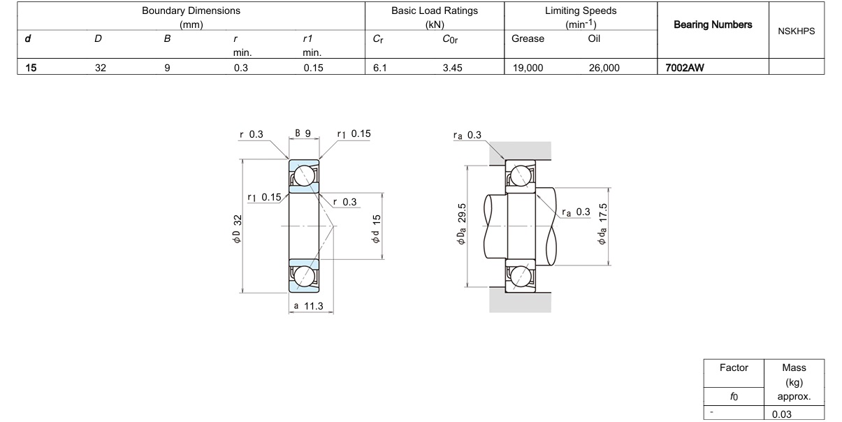 NSK 7002AW มีขนาดวงใน 15 มิล วงนอก 32 มิล หนา 9 มิล เป็นตลับลูกปืนเม็ดกลมแบบมุมสัมผัส 30 องศา แถวเดียว ไม่มีฝาปิด รังเหล็ก รองรับแรงโหลดได้ทั้งในแนวรัศมีและแนวแกนพร้อมๆ กันได้ดี