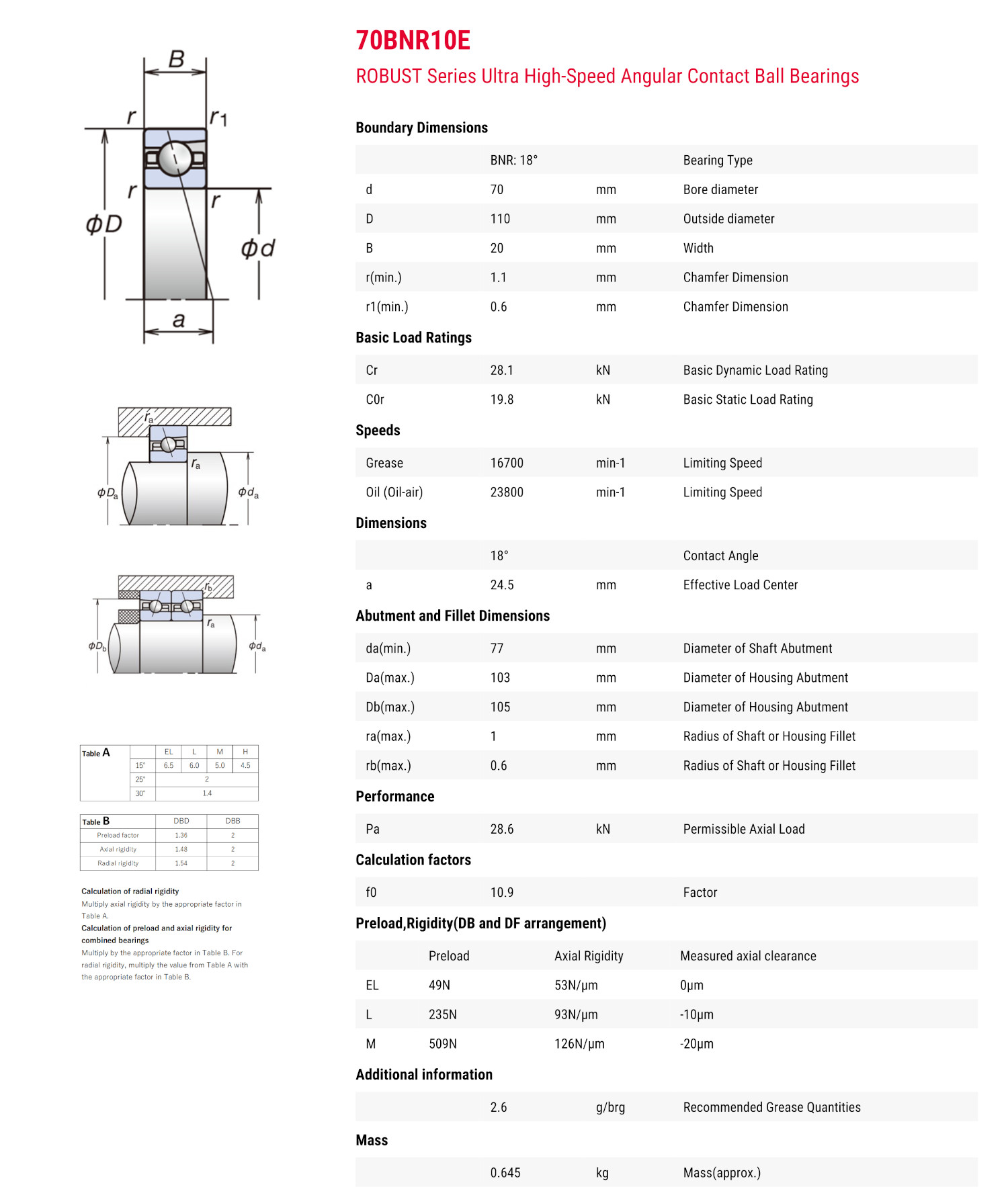 NSK 70BNR10ETYNDBLP4 มีขนาดวงใน 70 มิล วงนอก 110 มิล หนา 20 มิล เป็นตลับลูกปืนเม็ดกลมความเที่ยงตรงสูงรุ่น Robust มุมสัมผัส 18° องศา มีค่าความแม่นยำ ClassP4 รุ่นประกบคู่ รองรับความเร็วรอบได้สูงมาก
