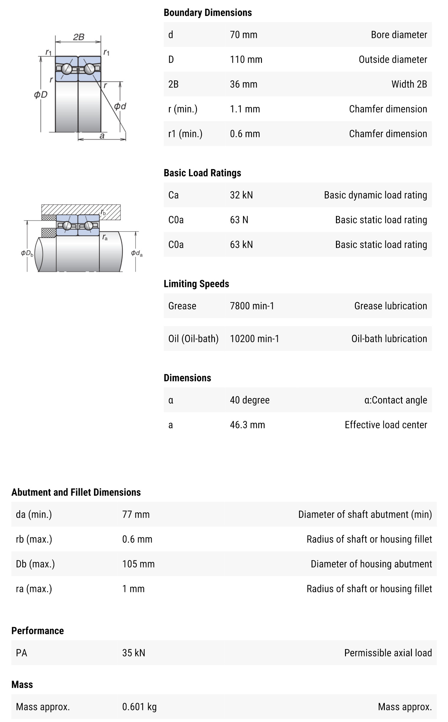 NSK 70BTR10ETYNDBLP4A มีขนาดวงใน 70 มิล วงนอก 110 มิล หนารวม 36 มิล เป็นตลับลูกปืนความเที่ยงตรงสูงเม็ดกลมกันรุนแบบมีมุมสัมผัส 40° องศา มีค่าความแม่นยำ Class P4A รุ่นประกบคู่ ใช้สำหรับงานรับแรงโหลดสูงในแนวแกน รองรับความเร็วรอบได้สูงมาก