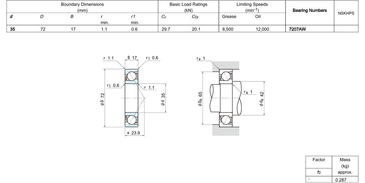 NSK 7207 AW มีขนาดวงใน 35 มิล วงนอก 72 มิล หนา 17 มิล เป็นตลับลูกปืนเม็ดกลมแบบมุมสัมผัส 30 องศา แถวเดียว ไม่มีฝาปิด รังเหล็ก รองรับแรงโหลดได้ทั้งในแนวรัศมีและแนวแกนพร้อมๆ กันได้ดี