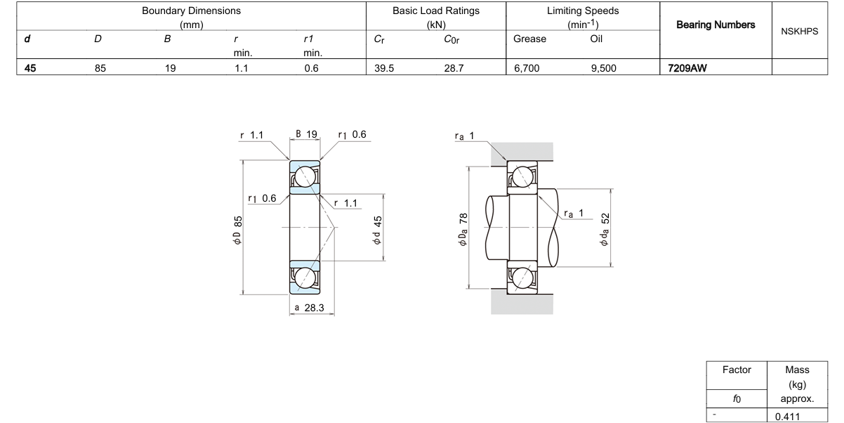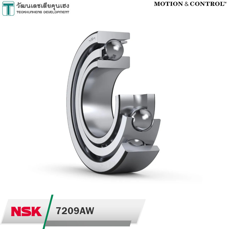 NSK 7209 AW มีขนาดวงใน 45 มิล วงนอก 85 มิล หนา 19 มิล เป็นตลับลูกปืนเม็ดกลมแบบมุมสัมผัส 30 องศา แถวเดียว ไม่มีฝาปิด รังเหล็ก รองรับแรงโหลดได้ทั้งในแนวรัศมีและแนวแกนพร้อมๆ กันได้ดี