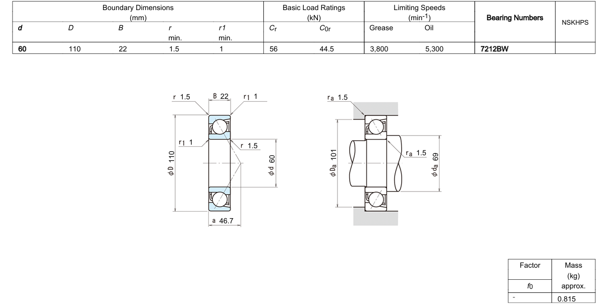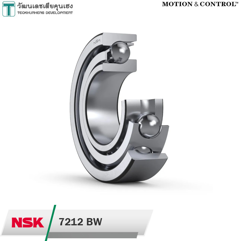 NSK 7212 BW มีขนาดวงใน 60 มิล วงนอก 110 มิล หนา 22 มิล เป็นตลับลูกปืนเม็ดกลมแบบมุมสัมผัส 40 องศา แถวเดียว ไม่มีฝาปิด รังเหล็ก รองรับแรงโหลดได้ทั้งในแนวรัศมีและแนวแกนพร้อมๆ กันได้ดี
