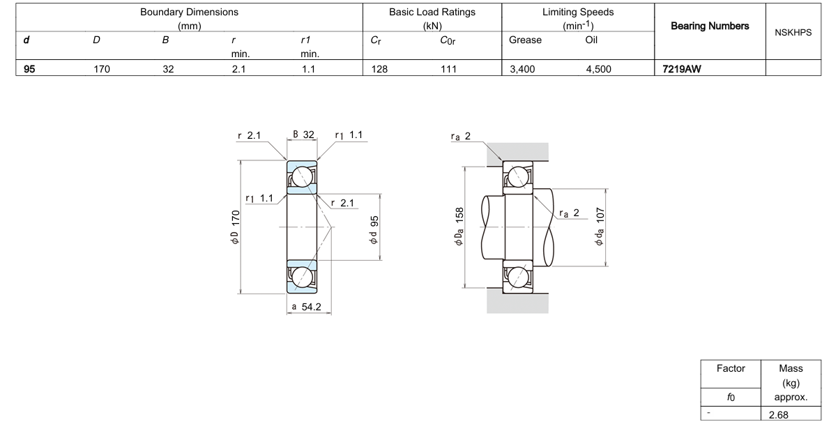 NSK 7219 AW มีขนาดวงใน 95 มิล วงนอก 170 มิล หนา 32 มิล เป็นตลับลูกปืนเม็ดกลมแบบมุมสัมผัส 30 องศา แถวเดียว ไม่มีฝาปิด รังเหล็ก รองรับแรงโหลดได้ทั้งในแนวรัศมีและแนวแกนพร้อมๆ กันได้ดี