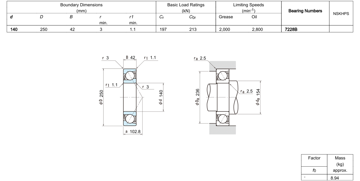 NSK 7228 B มีขนาดวงใน 140 มิล วงนอก 250 มิล หนา 42 มิล เป็นตลับลูกปืนเม็ดกลมแบบมุมสัมผัส 40 องศา แถวเดียว ไม่มีฝาปิด รังทองเหลือง รองรับแรงโหลดได้ทั้งในแนวรัศมีและแนวแกนพร้อมๆ กันได้ดี