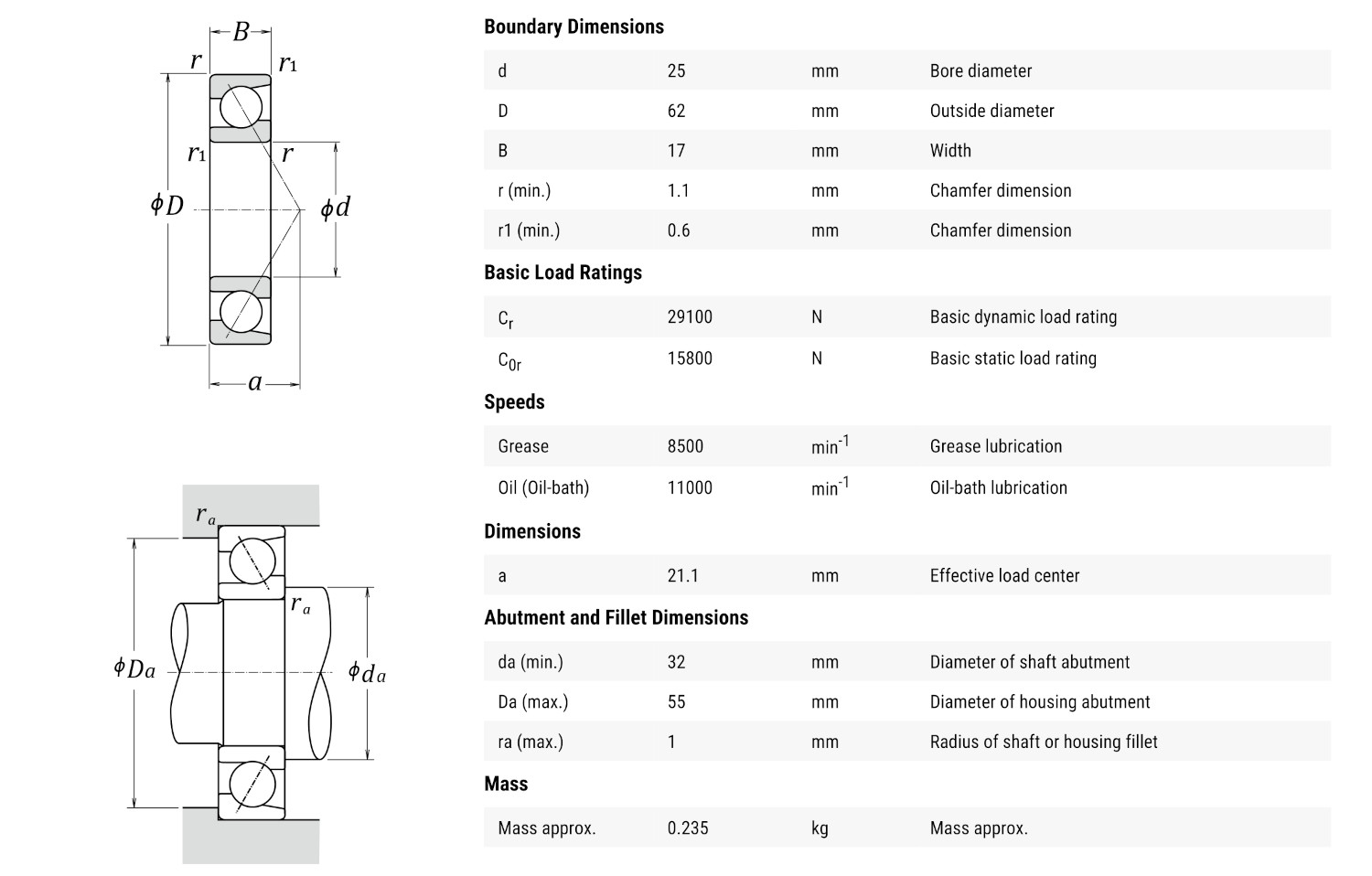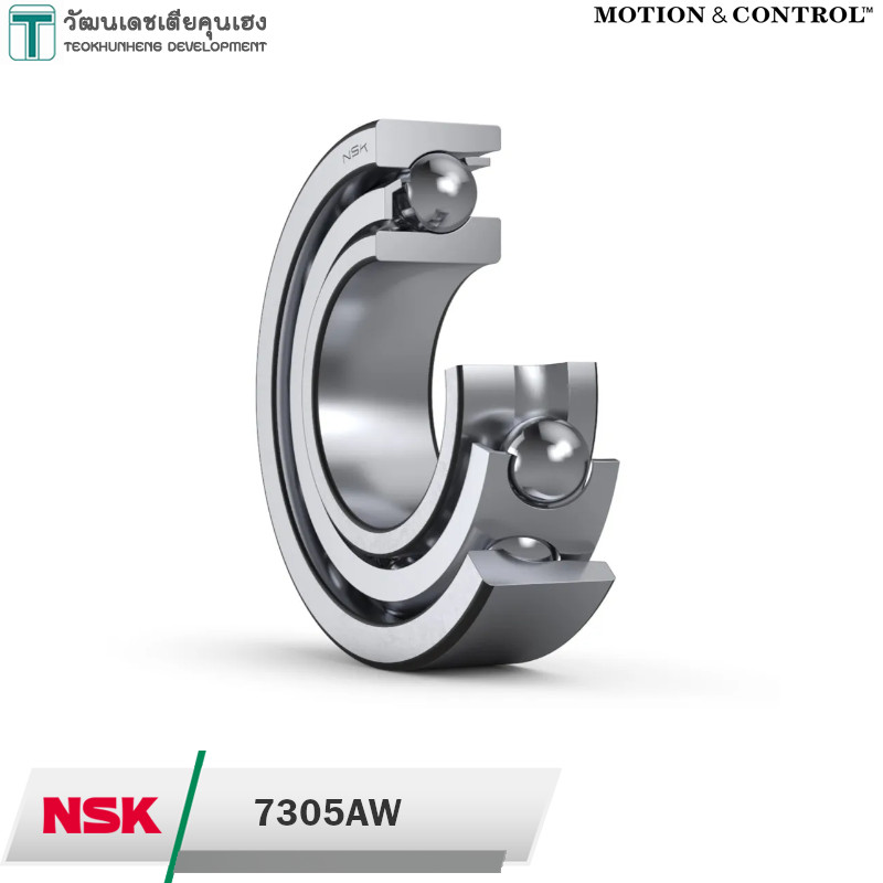 NSK 7305 AW มีขนาดวงใน 25 มิล วงนอก 62 มิล หนา 17 มิล เป็นตลับลูกปืนเม็ดกลมแบบมุมสัมผัส 30 องศา แถวเดียว ไม่มีฝาปิด รังเหล็ก รองรับแรงโหลดได้ทั้งในแนวรัศมีและแนวแกนพร้อมๆ กันได้ดี