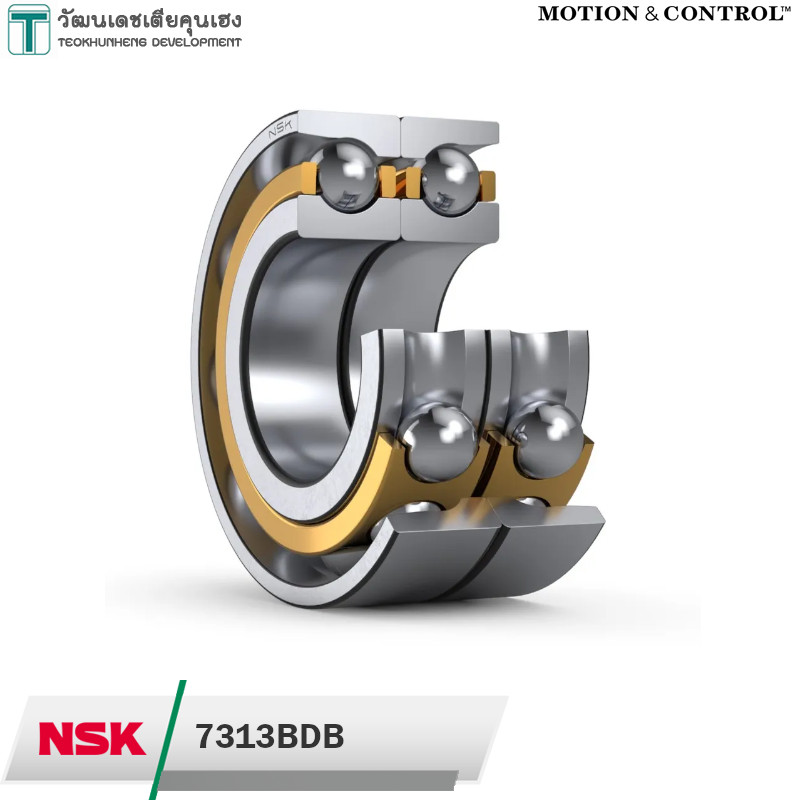NSK 7313 BDB มีขนาดวงใน 65 มิล วงนอก 140 มิล หนา 33 มิล หนารวม 66 มิล เป็นตลับลูกปืนเม็ดกลมแบบมุมสัมผัส 40 องศา ประกบคู่แบบหลังชนหลัง (Back-to-Back) รังทองเหลือง รองรับแรงโหลดได้ทั้งในแนวรัศมีและแนวแกนพร้อมๆ กันได้ดี