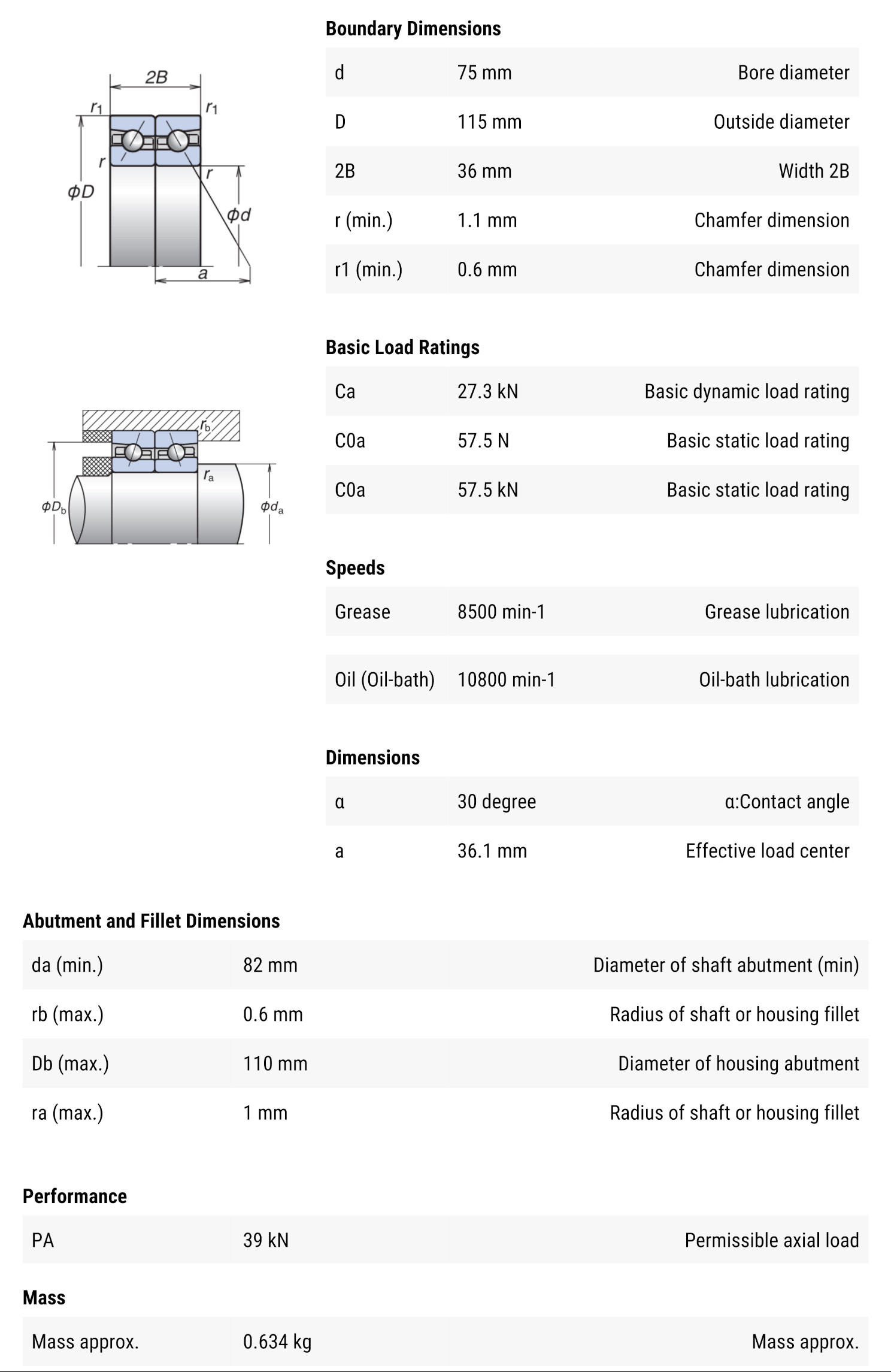 NSK 75BAR10ETYNDBLP4A มีขนาดวงใน 75 มิล วงนอก 115 มิล หนารวม 36 มิล เป็นตลับลูกปืนความเที่ยงตรงสูงเม็ดกลมกันรุนแบบมีมุมสัมผัส 30° องศา มีค่าความแม่นยำ Class P4A รุ่นประกบคู่ ใช้สำหรับงานรับแรงโหลดสูงในแนวแกน รองรับความเร็วรอบได้สูงมาก