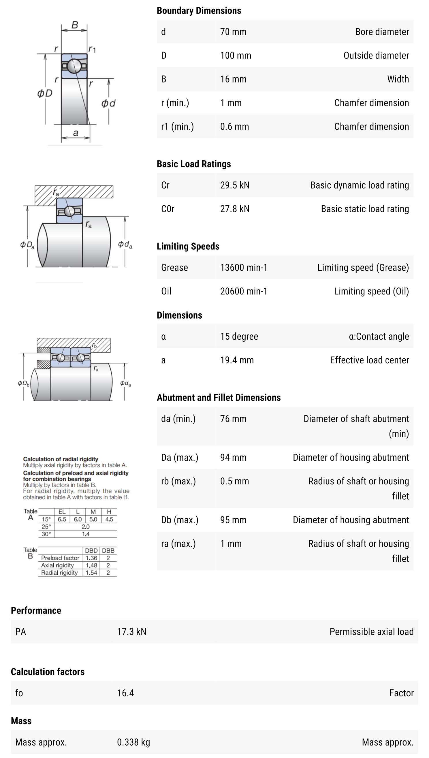 NSK 7914 CTYNSULP4 มีขนาดวงใน 70 มิล วงนอก 100 มิล หนา 16 มิล เป็นตลับลูกปืนความเที่ยงตรงสูงเม็ดกลมแบบมุมสัมผัส 15° องศา มีค่าความแม่นยำ Class 4 รุ่นเดี่ยว รองรับความเร็วรอบได้สูงมาก