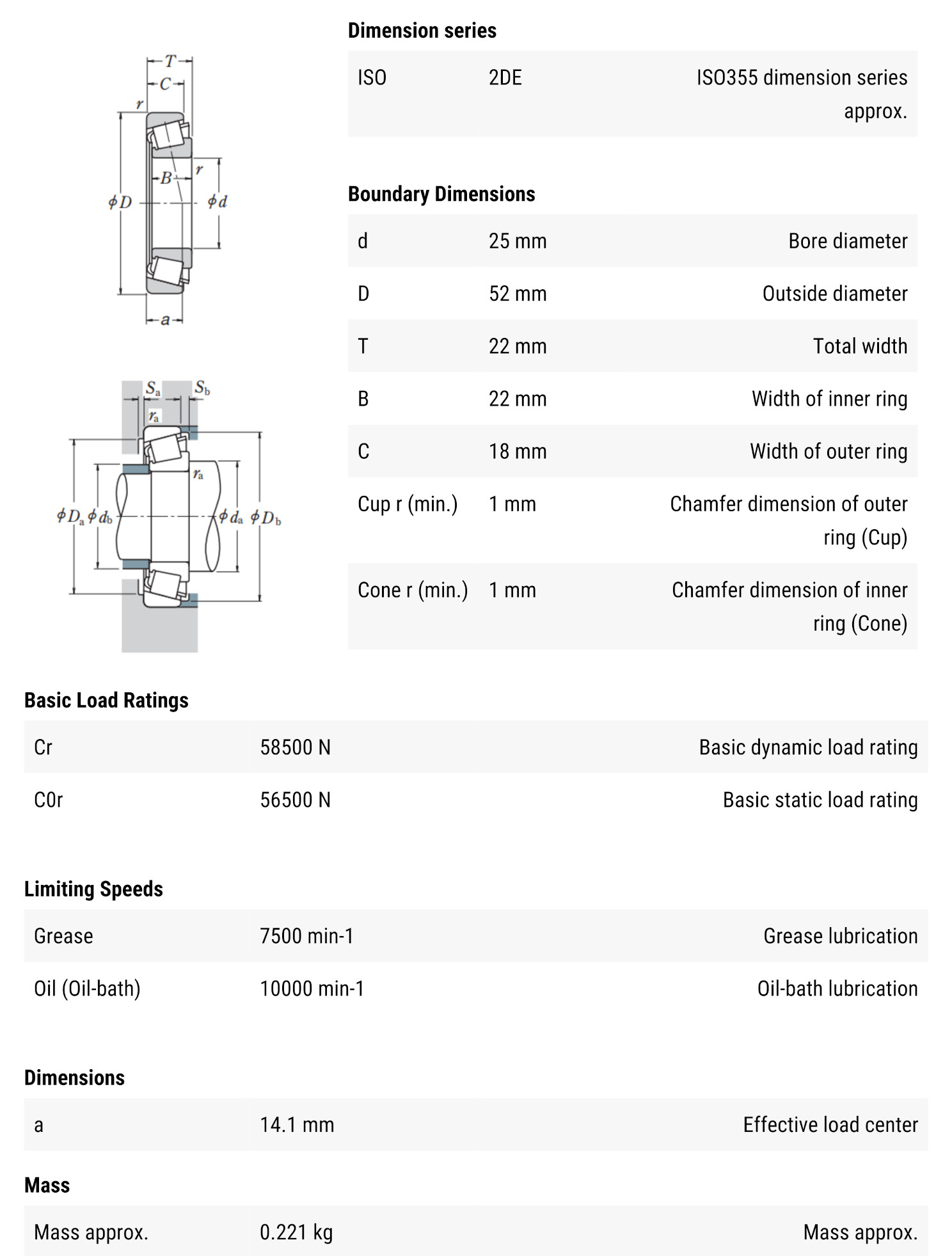 NSK HR33205J มีขนาดวงใน 25 มิล วงนอก 52 มิล หนารวม 22 มิล เป็นตลับลูกปืนเม็ดเรียว หรือที่เรียกว่า เตเปอร์ (Tapered) แกนนอกมีลักษณะเป็นปลอกคล้ายถ้วย (Cup) แยกออกจากตัวลูกปืน(Cone)ได้ ทำให้สะดวกต่อการติดตั้ง สามารถรองรับแรงโหลดได้สูงทั้งแนวรัศมีและแนวแกน