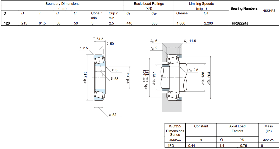 NSK HR32224J มีขนาดวงใน 120 มิล วงนอก 215 มิล หนารวม 61.5 มิล เป็นตลับลูกปืนเม็ดเรียว หรือที่เรียกว่า เตเปอร์ (Tapered) แกนนอกมีลักษณะเป็นปลอกคล้ายถ้วย (Cup) แยกออกจากตัวลูกปืน(Cone)ได้ ทำให้สะดวกต่อการติดตั้ง สามารถรองรับแรงโหลดได้สูงทั้งแนวรัศมีและแนวแกน