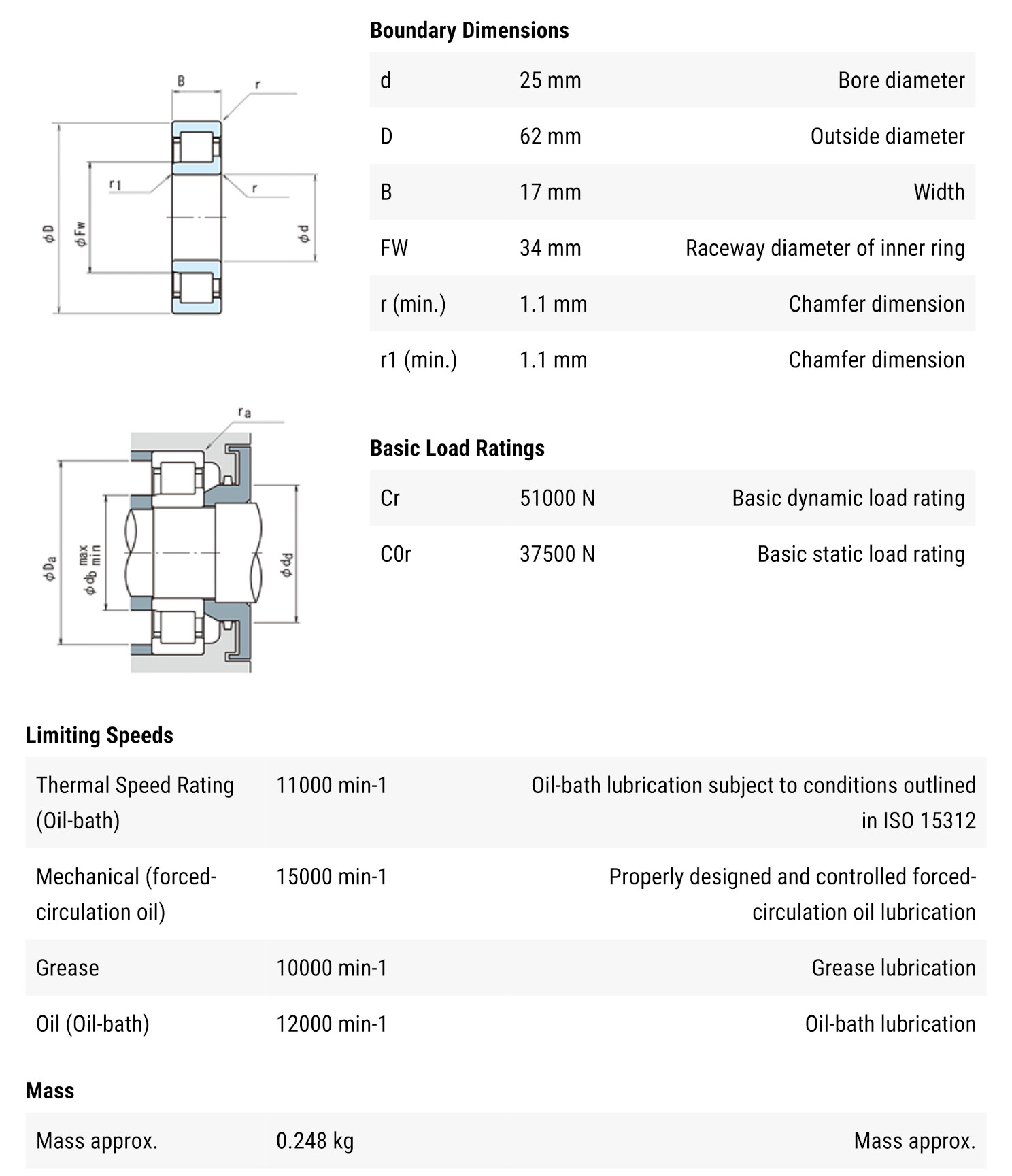 NSK NJ 305 EWC3 มีขนาดวงใน 25 มิล วงนอก 62 มิล หนา 17 มิล เป็นตลับลูกปืนเม็ดทรงกระบอก แกนในสามารถถอดหลุดออกได้ด้านเดียว ทำให้สะดวกต่อการติดตั้ง รองรับแรงโหลดได้สูงมาก
