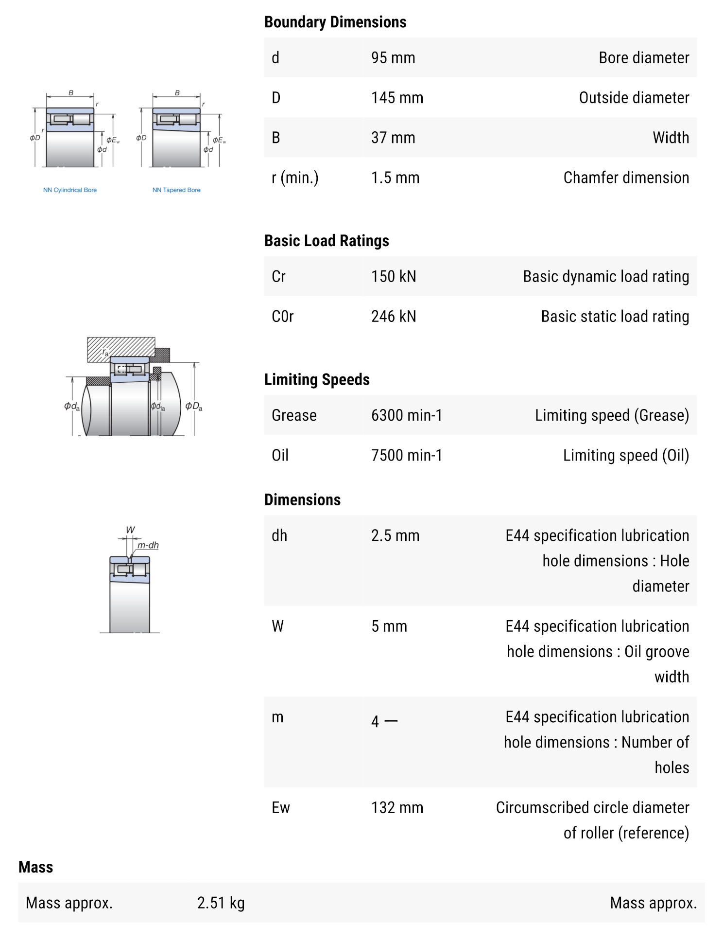 NSK NN3019MBKRCC1P4 มีขนาดวงใน 95 มิล วงนอก 145 มิล หนา 37 มิล เป็นตลับลูกปืนความเที่ยงตรงสูงเม็ดทรงกระบอกสองแถว รังทองเหลือง แกนในรูเฉียง มีค่าความแม่นยำ Class4 แกนนอกสามารถหลุดได้ตลอดทั้งสองด้าน ทำให้สะดวกต่อการติดตั้ง รองรับแรงโหลดได้สูงมาก