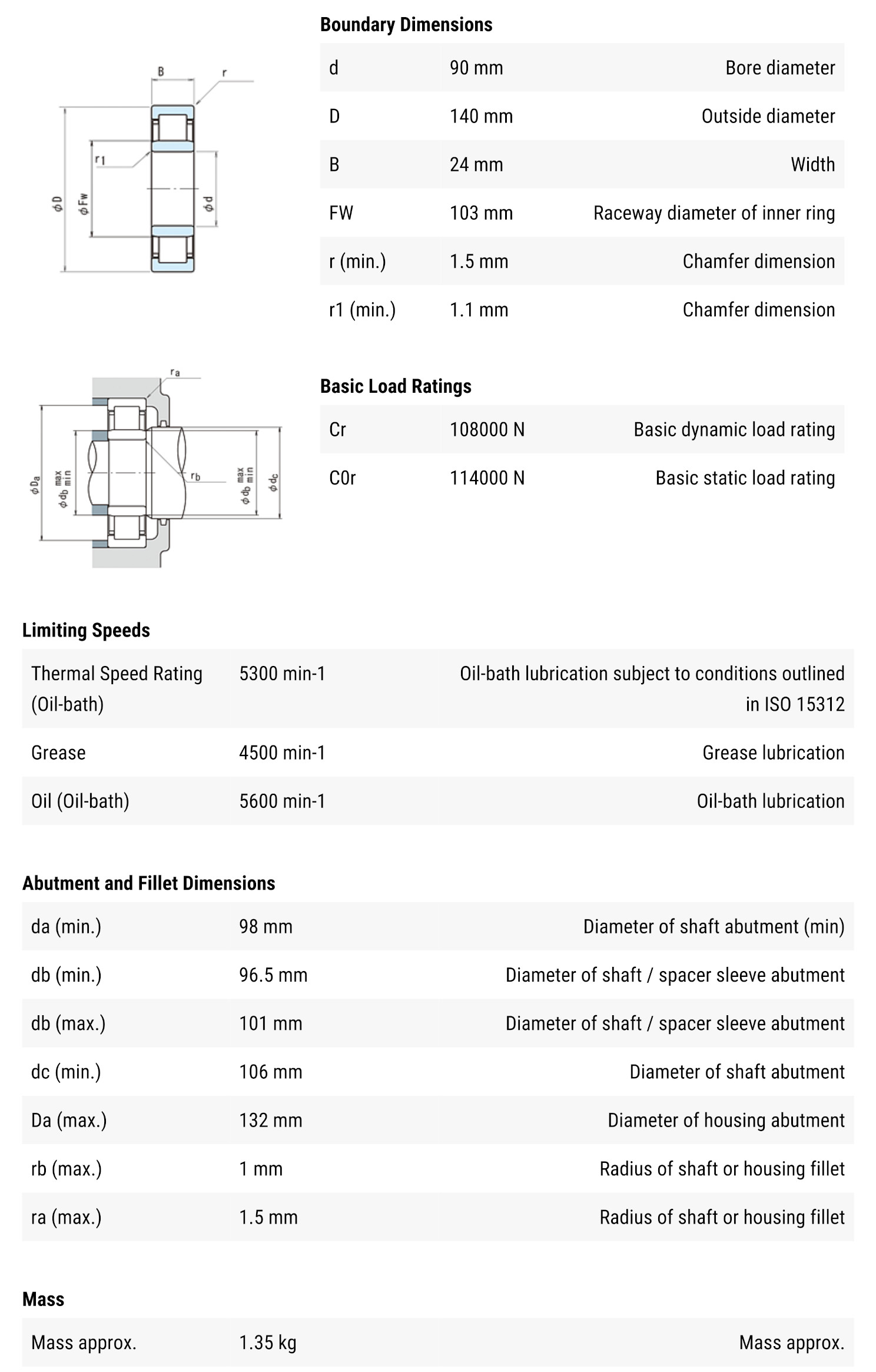 NSK NU1018W มีขนาดวงใน 90 มิล วงนอก 140 มิล หนา 24 มิล เป็นตลับลูกปืนเม็ดทรงกระบอกแถวเดียว มีลักษณะแกนในที่สามารถถอดหลุดออกได้ทั้ง 2 ด้าน ทำให้สะดวกต่อการติดตั้ง รองรับแรงโหลดได้สูงมาก