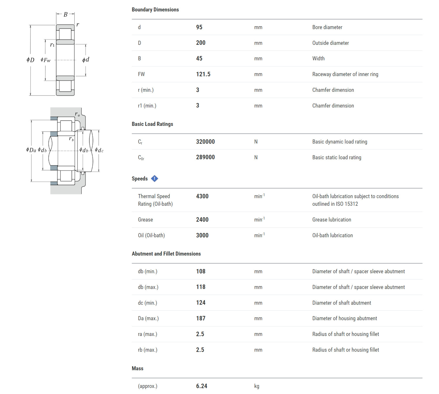 NSK NU319WC3 มีขนาดวงใน 95 มิล วงนอก 200 มิล หนา 45 มิล เป็นตลับลูกปืนเม็ดทรงกระบอกแถวเดียว NU Design มีลักษณะแกนในที่สามารถถอดหลุดออกได้ทั้ง 2 ด้าน ทำให้สะดวกต่อการติดตั้ง รองรับแรงโหลดได้สูงมาก