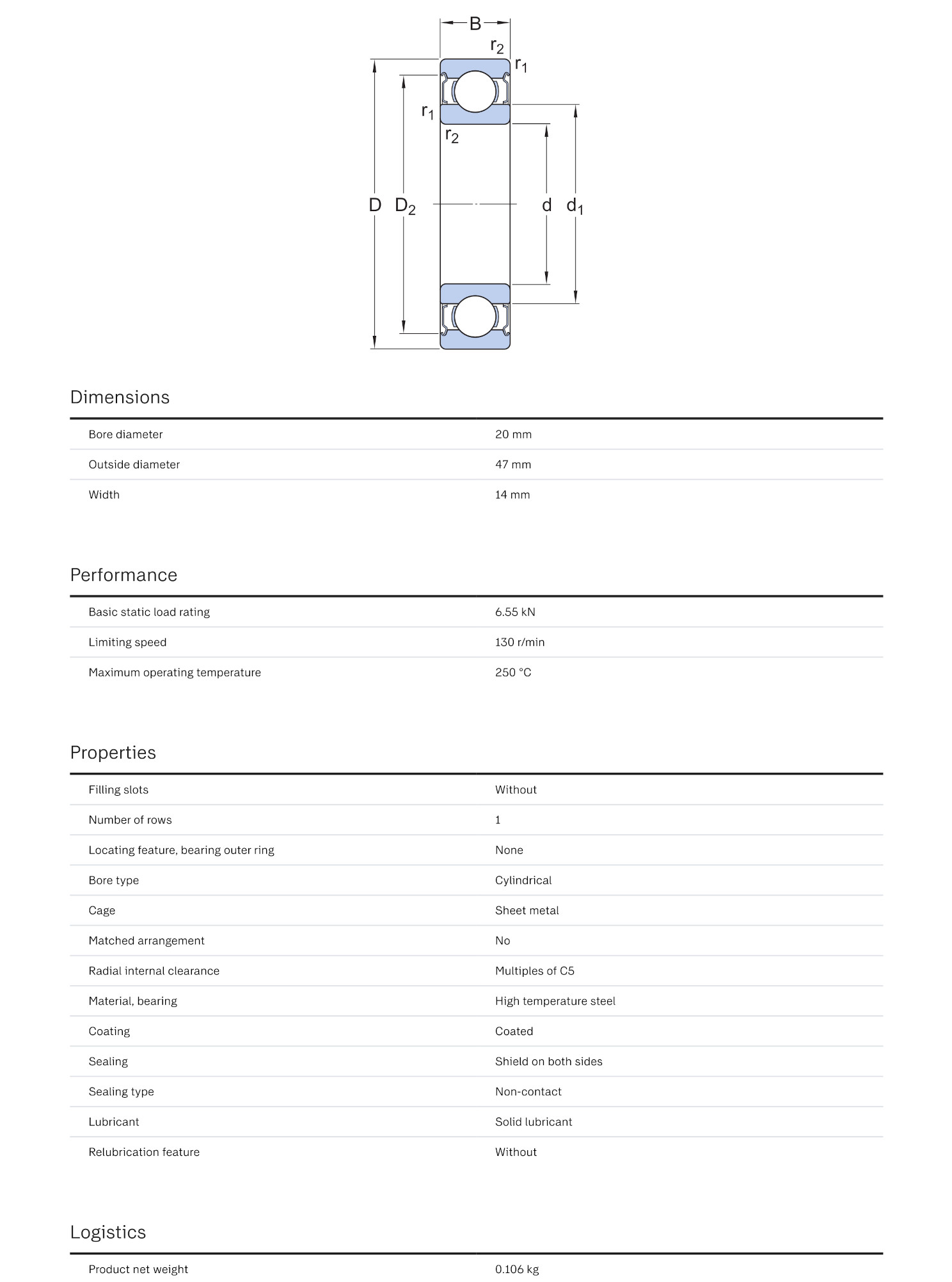 SKF 6204-2Z/VA201 มีขนาดวงใน 20 มิล วงนอก 47 มิล หนา 14 มิล เป็นตลับลูกปืนเม็ดกลมร่องลึก รังเหล็ก มีฝาเหล็กสองด้าน มีคุณสมบัติทนความร้อนสูง สามารถใช้งานกับสภาพแวดล้อมที่มีอุณหภูมิสูงถึง 250 องศาเซลเซียส รองรับแรงทั้งแนวรัศมีและแนวแกน